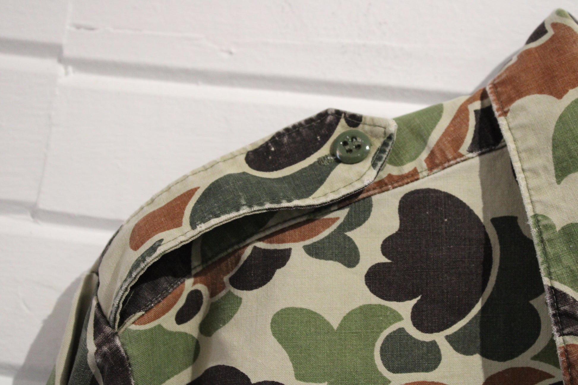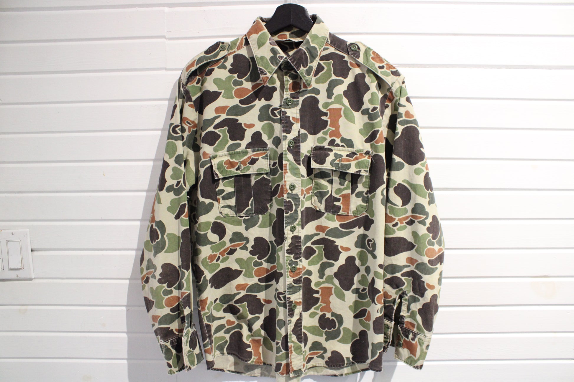 Vintage Walls duck-hunter camo button-up shirt featuring dual chest pockets and classic outdoor styling.