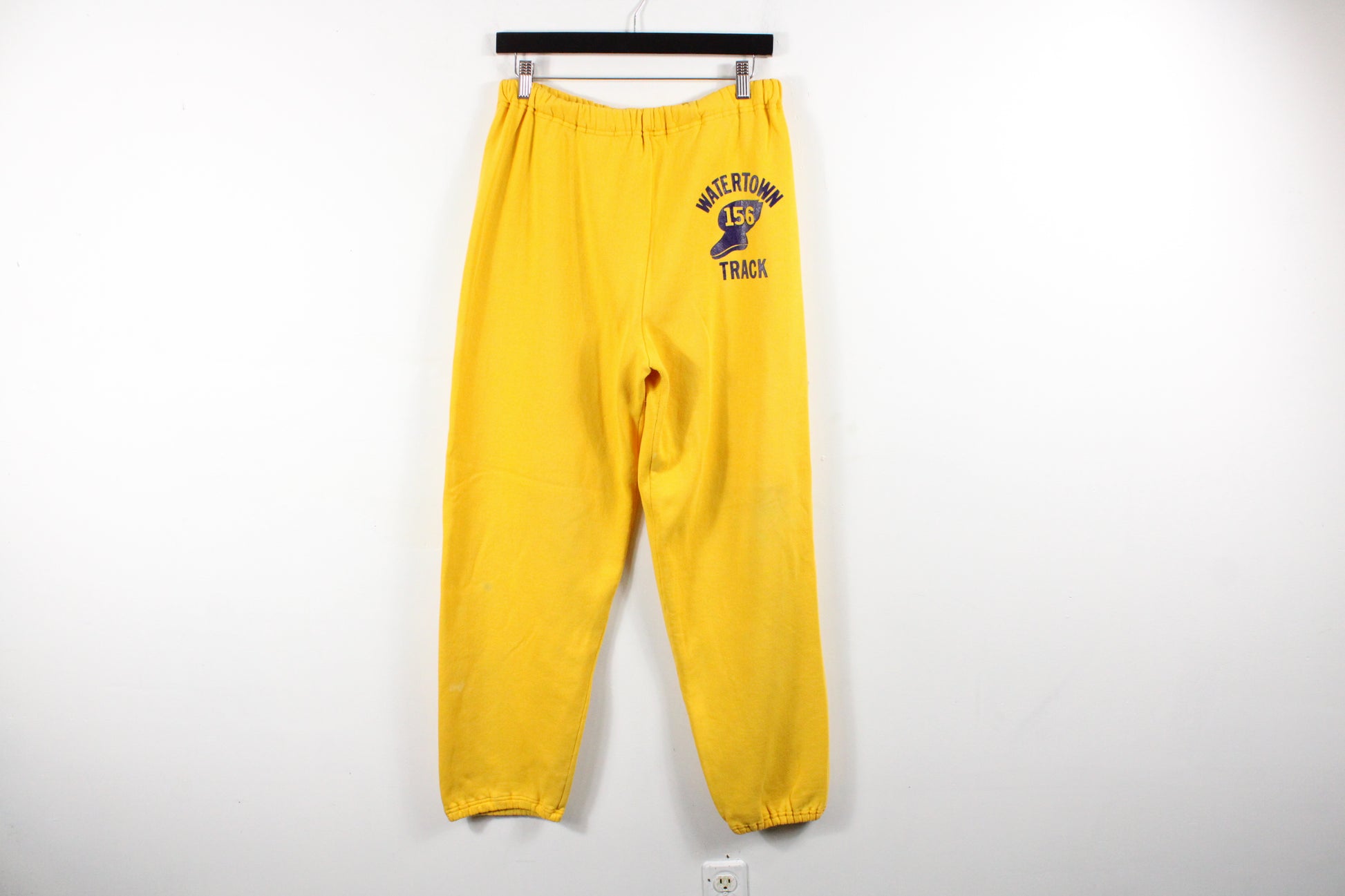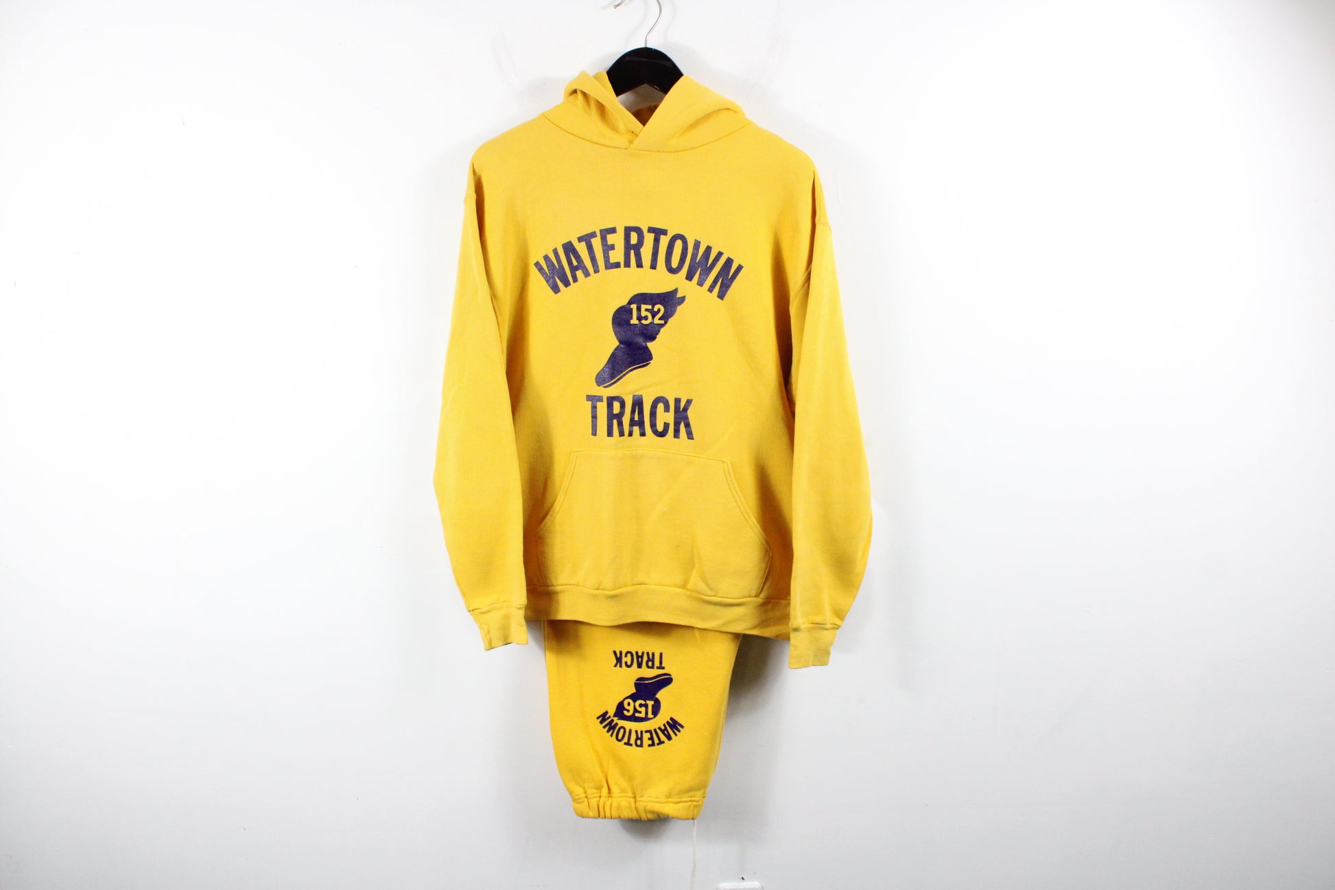 Vintage Watertown Track hoodie and sweatpants set featuring bold collegiate graphics with winged foot print, classic yellow color, and a comfortable relaxed fit.