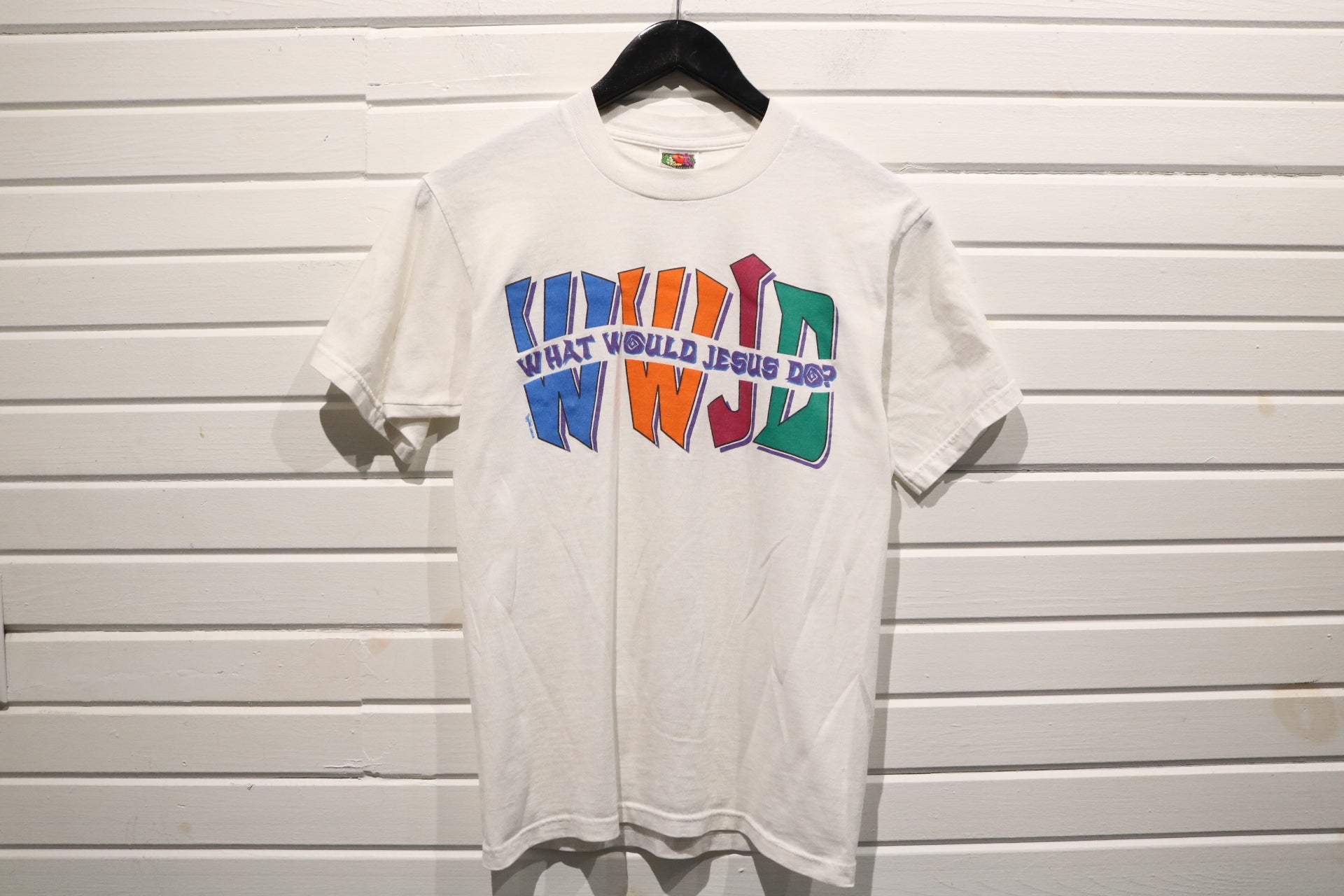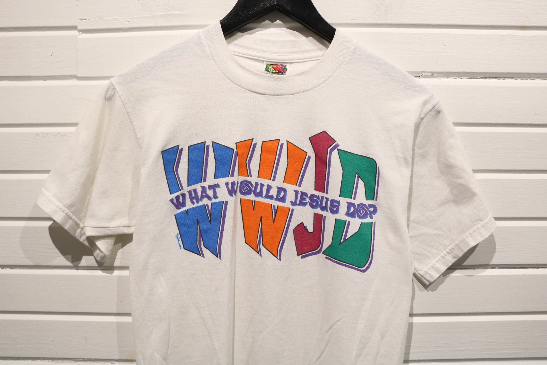 Vintage What Would Jesus Do WWJD T-Shirt from the 1990s with bold multicolor front graphic and Trinity Lutheran Church print on the back.