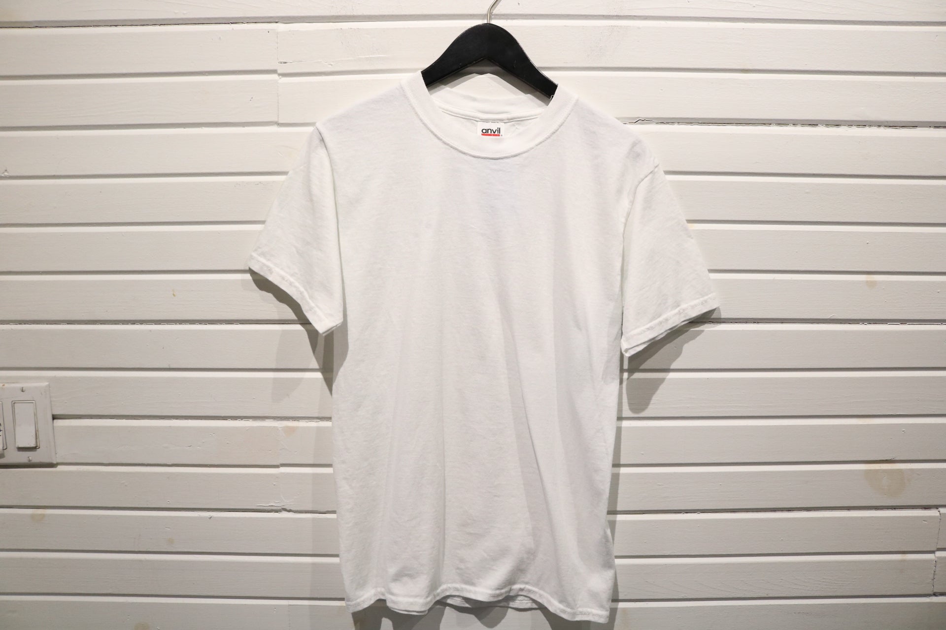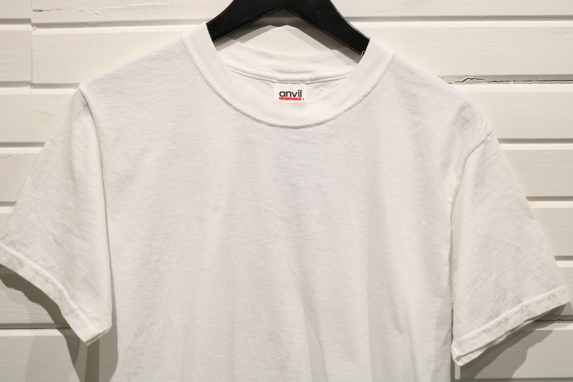 Classic 1990s plain white t-shirt with a timeless crewneck and short sleeves.