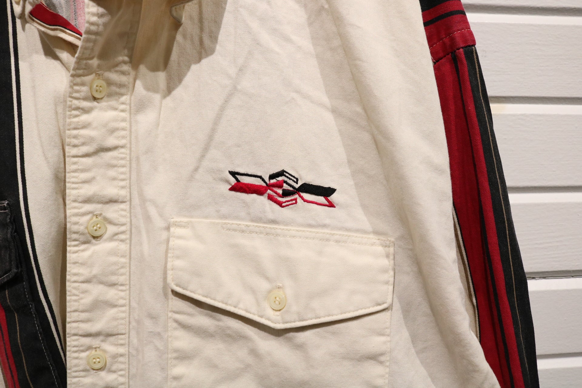 Vintage Wrangler Western Stripe Button-Up Shirt with bold cream, red, and black color block pattern and chest embroidery.