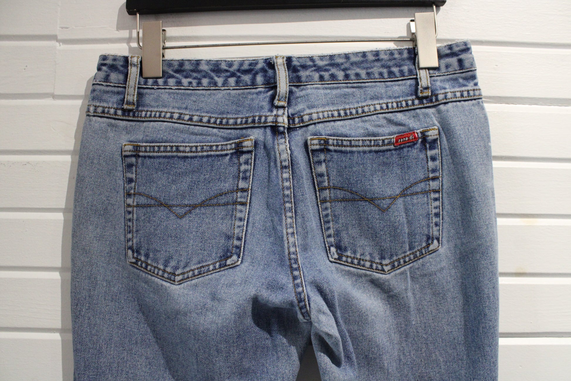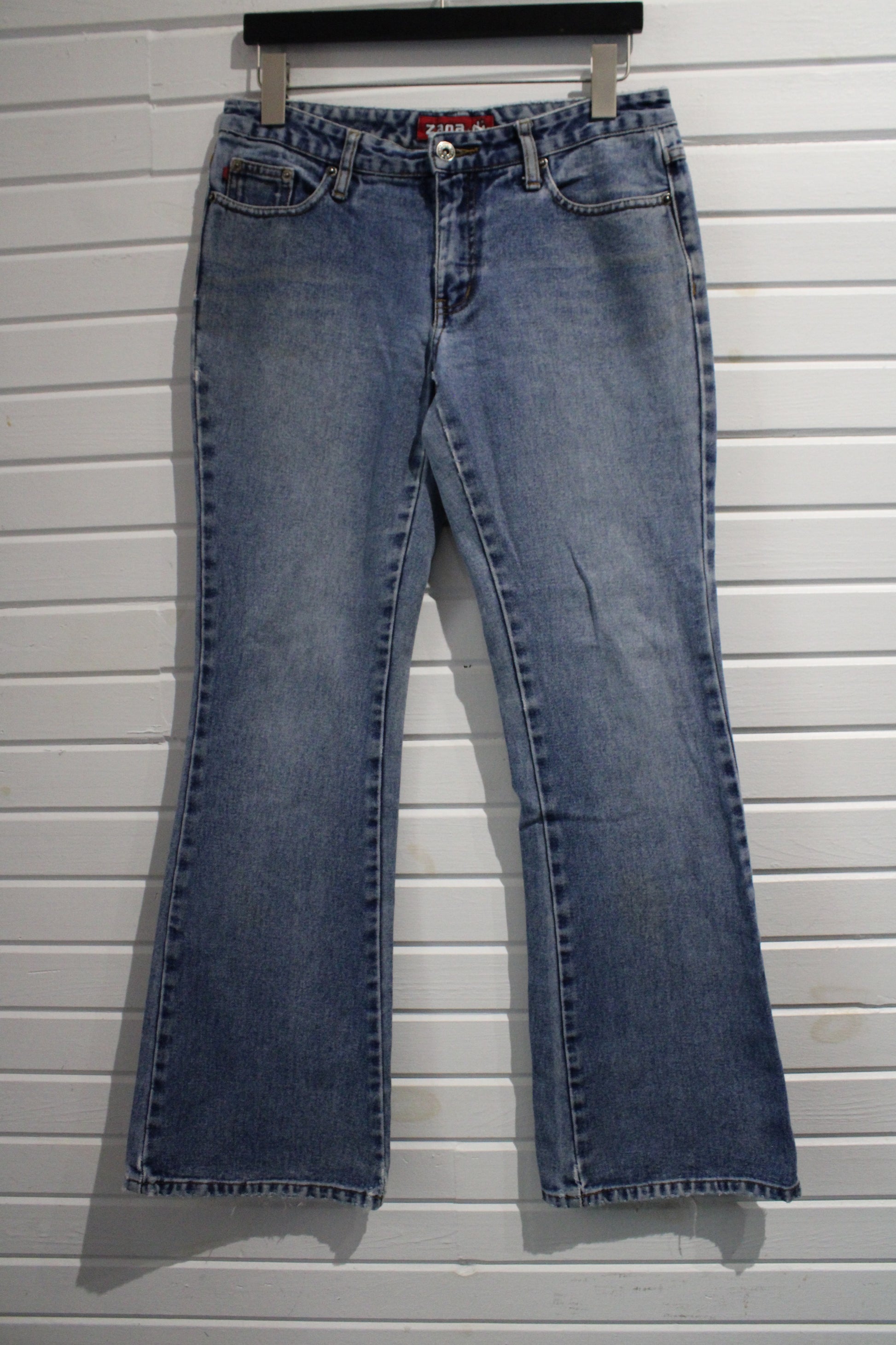Vintage Zana-Di bootcut denim jeans featuring a medium blue wash and frayed hems for a classic look.